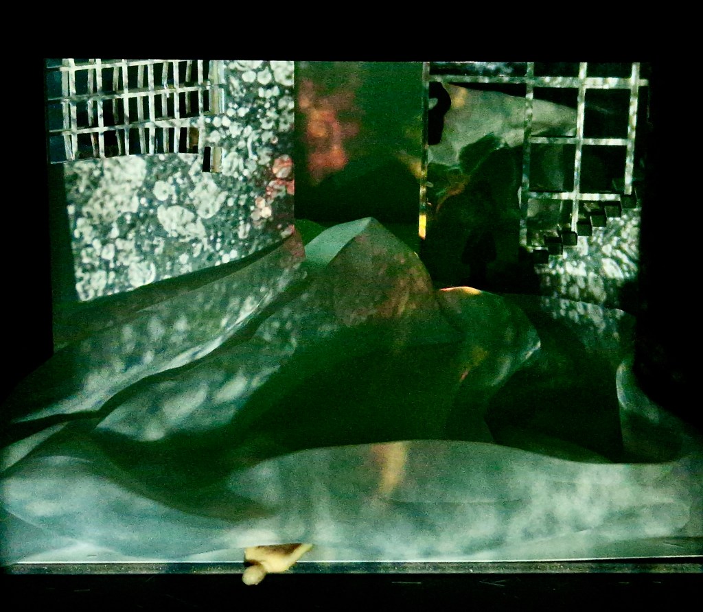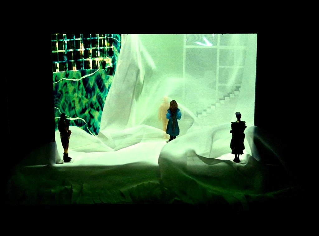 The stage environment is a visceral blend of industrial aesthetics and psychological horror. Factory walls, cold stairwells, and windows serve as the backdrop for a world where reality and nightmare merge. The stage is initially cloaked in a semi-transparent projection fabric that eventually collapses, revealing the brutal truth beneath the surface. This effect, enhanced by dynamic video projections and light, captures the core themes of disgust, human longing, and physical decay that permeate the narrative.